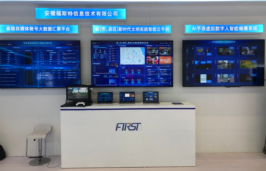 安徽福斯特信息技術有限公司此次應邀參展,以廣電媒體發(fā)展為亮點,集中展示大數據、人工智能,呈現了AI-VLOG視頻智能合成系統+AI手語虛擬數字人智能編播系統+省級自媒體賬號大數據匯聚平臺+?。ㄊ?、縣區)新時代文明實踐智能云平臺技術。